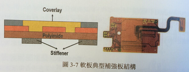 一般最常用于柔性電路板強(qiáng)化的做法,是采用背板固定模式,也有人稱這種背板強(qiáng)化叫補(bǔ)強(qiáng)板。所謂加背板,就是在必要強(qiáng)化的區(qū)域墊上較硬的材料,借以降低柔軟度并便利后續(xù)組裝。圖3-7所示,為柔性電路板典型補(bǔ)強(qiáng)固定結(jié)構(gòu)。用于強(qiáng)化的材料包括低價(jià)的膠板或金屬板,某些PI材料的強(qiáng)化會(huì)要求使用同種PI材料,以符合產(chǎn)品高信賴度要求,而某些要求較寬的產(chǎn)品則嘗試使用聚脂樹(shù)脂膠片作強(qiáng)化,以降低制作成本。