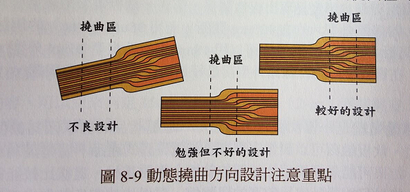 產(chǎn)品加入軟板設(shè)計,可以讓設(shè)計者一些線路分割,零件組裝的部分可以用支撐方式強(qiáng)化達(dá)成類似硬板的結(jié)構(gòu),這些設(shè)計的可能性都讓軟板繞線整合技術(shù)應(yīng)用范圍更加寬廣。但是恰當(dāng)?shù)膿锨较騾s是軟板設(shè)計的重點,圖8-9所示為軟板設(shè)計采用撓曲性的基本考慮方式。