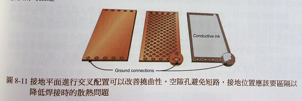 接地區(qū)域,在電性允許狀況下應(yīng)該要進(jìn)行交叉打線的設(shè)計,這種做法可以同時幫助降低重量與改善軟板撓曲性。接地平面的開口尺寸可能是關(guān)鍵,必須搭配產(chǎn)品遮蔽性或特性阻抗控制來決定。如果開口過大,遮蔽效應(yīng)可能會受到破壞,這方面會與頻率相關(guān)。同時在接地銅面連接元件部分,應(yīng)該要降低熱釋放的狀況,并確認(rèn)可以形成良好的焊錫結(jié)合。這可以利用在襯墊四周蝕刻出空區(qū)來達(dá)成,不過仍然要保持電性連接,圖8-11所示,為這個接地連接技術(shù)的描述。
