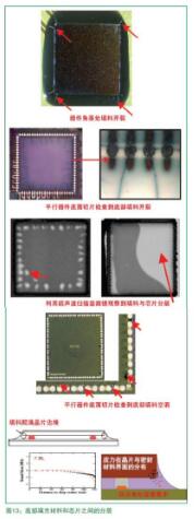 將仿真芯片從聚亞酰胺基材上切割下來,黏合載玻片以加強軟性仿真芯片的結(jié)構(gòu)強度,打上柱形金凸塊,然后以前述的兩種方法(絕緣的熱硬化黏膠接合技術(shù)、導電的熱硬化黏膠接合技術(shù))將仿真芯片與柔性載板接合起來。由于這個做在聚亞酰胺基材上的仿真芯片是半透明的,我們能夠以目檢檢視接合的界面。柱形金凸塊看起來是很平均的被壓縮,這表示平面度控制得很好。對準的精確度控制在3微米之內(nèi)??梢钥吹皆陴つz層之內(nèi)有一些空氣氣泡,但是,這些空氣氣泡看來并不會影響效能。