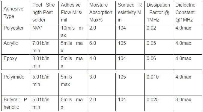 在柔性板設(shè)計(jì)時(shí),選擇合適的膠來(lái)粘接導(dǎo)體和介質(zhì)也是非常重要的。它必須保證FPC 在加工時(shí)不脫膠或不過多地溢膠。柔性板常用的膠有丙烯酸(acrylic),改良環(huán)氧樹脂(modified epoxy), 酚丁縮醛(Phenolic Butyrals),增強(qiáng)膠,壓敏膠等等。下表列舉了幾種膠的特性。