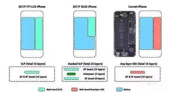 同樣是4.7寸,電池容量怎么做到增加獎金1000mAh?據(jù)分析師說,蘋果會在iPhone 8身上采用堆疊式類板(Substrate-like PCB/SLP),可以堆上多達20層,從而大大減小主板面積,將更多內部空間留給電池。