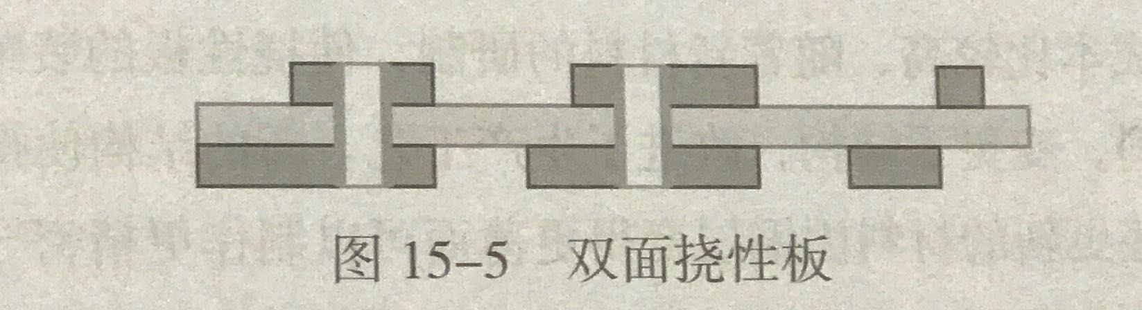 在絕緣基材的兩面銅箔上經(jīng)過蝕刻后形成雙面導(dǎo)電圖形,并通過孔金屬化將兩面導(dǎo)電圖形連接形成導(dǎo)電通路,稱之為雙面柔性電路板。見圖15-5所示。