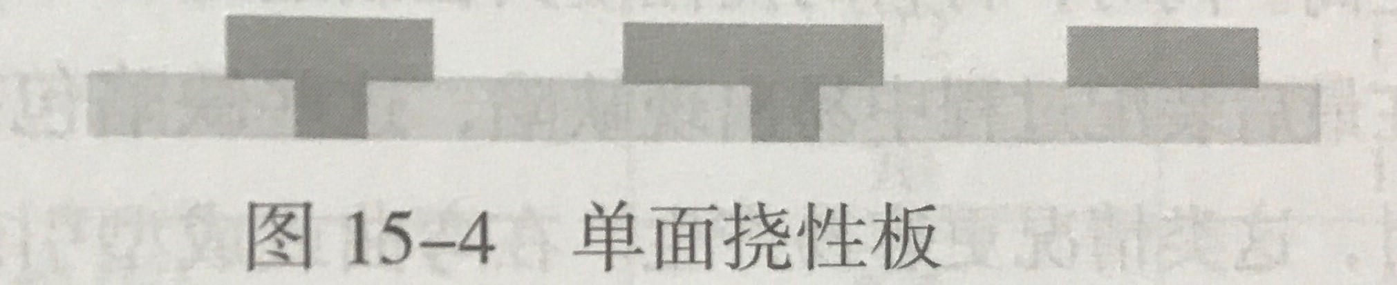 在絕緣基材的一面銅箔上經(jīng)過蝕刻后形成的導(dǎo)電圖形,稱之為單面柔性電路板。絕緣基材可選擇聚酰亞胺薄膜、聚對苯甲酸乙醇酯、芳酰胺纖維和聚氯乙烯。見圖15-4所示