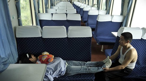 他——一個(gè)坐火車的農(nóng)民,為了讓女兒有個(gè)舒適的睡姿,一直抱著女兒的腿……