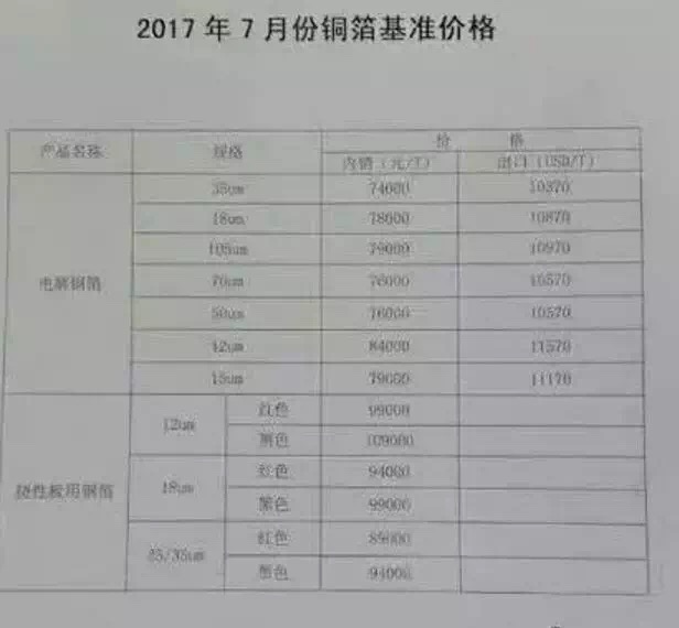 銅箔出貨價(jià)格上調(diào),2000元/噸;電解銅價(jià)格上漲,銅箔每噸上調(diào)1000元,外銷每噸上調(diào)130美元;2017年7月份電解銅箔基準(zhǔn)價(jià)格為:35um,內(nèi)銷74000元/噸,外銷10370元/噸。