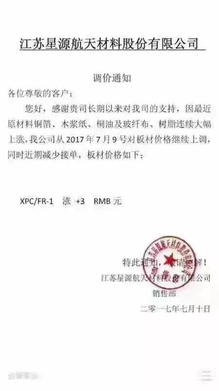 星源航天PCB板材XPC/FR-1漲3元