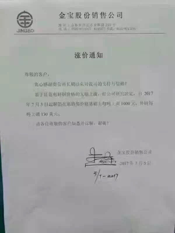 7月5日,國內(nèi)山東金寶發(fā)布銅箔漲價(jià)通知