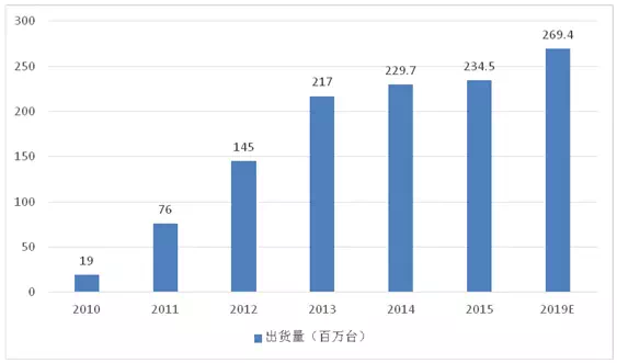 2010年,蘋果iPad 在全世界掀起了平板電腦熱潮,平板電腦以小型、方便攜帶、觸摸操控的特性對(duì)整個(gè)電子產(chǎn)品行業(yè)帶來了革命性的影響。平板電腦的興起成為近年FPC市場(chǎng)增長(zhǎng)的另一主要?jiǎng)恿Α?010年平板電腦的出貨量?jī)H有1,900萬(wàn)臺(tái),2013年達(dá)到2.17億臺(tái),年均增速125.20%。在經(jīng)歷2010年-2013年的高速發(fā)展之后,未來平板電腦可能進(jìn)入穩(wěn)步發(fā)展期,2015年全球平板電腦出貨量為2.345億臺(tái),預(yù)計(jì)2019 年全球平板電腦出貨量將達(dá)2.694億臺(tái)。