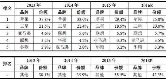 2013-2016年平板電腦前五大品牌市場(chǎng)排名