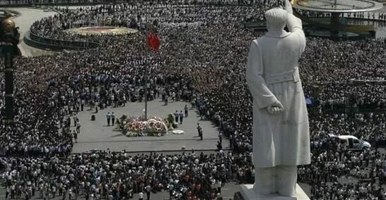 2008年5月19日14時(shí)28分,成都天府廣場(chǎng)降半旗志哀,四川省萬(wàn)余人為汶川大地震遇難者默哀3分鐘。