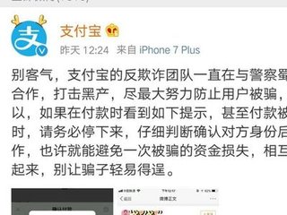 隨后,支付寶官方進行回應(yīng)稱,“支付寶的反欺詐團隊一直在與警察蜀黍們合作,打擊黑產(chǎn),盡最大努力防止用戶被騙,所以,如果在付款時看到如下提示,甚至付款被中斷時,請務(wù)必停下來,仔細判斷確認對方身份后再操作。”