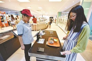 與結(jié)賬臺桌面屏幕對應(yīng)的是一個傾斜45度角、15英寸寬的立式屏幕,是為工作人員設(shè)置的。這個結(jié)構(gòu)很像了超市的柜臺,但與之不同的是,這里的結(jié)算是自動感應(yīng)的,無需掃碼槍。從把托盤放在結(jié)算區(qū)到刷卡再到把托盤端走,整個過程只需三秒時間。