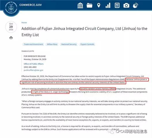 美國(guó)商務(wù)部于29日宣布基于國(guó)家安全考量,將限制美國(guó)廠商與相關(guān)企業(yè)銷售半導(dǎo)體設(shè)備、材料給福建晉華,禁令于10月30日正式生效,后者是中國(guó)DRAM存儲(chǔ)技術(shù)陣營(yíng)的主要廠商。另?yè)?jù)FPC廠了解,路透社10月29日?qǐng)?bào)道,美國(guó)商務(wù)部29日稱已將福建晉華集成電路有限公司列入不能從美國(guó)企業(yè)采購(gòu)部件、軟件和技術(shù)產(chǎn)品的“實(shí)體名單”。