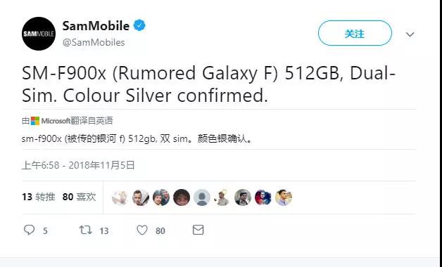 11月5日,三星官方Twitter確認了旗下首款柔性折疊手機的部分硬件特性:其型號為SM-F900x(傳聞中的Galaxy F),擁有512GB存儲、支持雙SIM卡,機身顏色則為銀色。