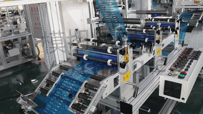 8、進(jìn)入三工位貼合機(jī)排廢整版材料外框后收卷成型。