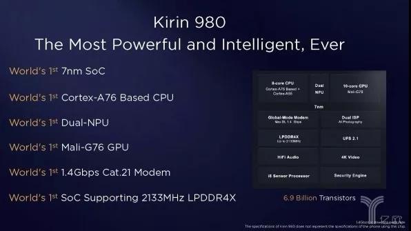 麒麟系列芯片是終端算力的基礎(chǔ)。尤其是麒麟980,作為全球首款量產(chǎn)的7nm手機(jī)芯片、雙NPU加持,麒麟980共拿下全球六項(xiàng)第一,助力華為手機(jī)攀上智慧新高度。