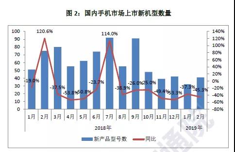 2019年1~2月,上市新機(jī)型73款,同比下降42.1%,上市新機(jī)型中含2G手機(jī)13款、3G手機(jī)1款,4G手機(jī)59款。
