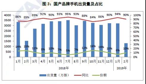 2019年1~2月,國產(chǎn)品牌手機(jī)出貨量4516.8萬部,同比下降7.6%,占同期手機(jī)出貨量的93.0%;上市新機(jī)型65款,同比下降42.0%,占同期手機(jī)上市新機(jī)型數(shù)量的89.0%。