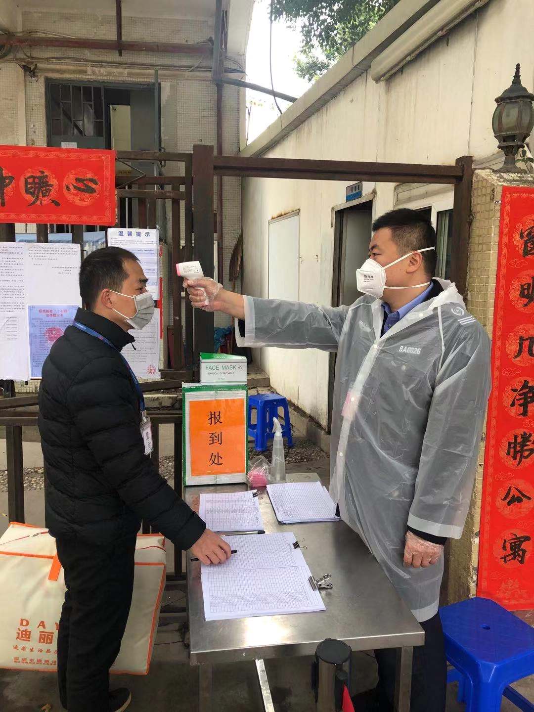疫情期間,他們毫不懈怠,為公司樹立第一道防線。日常工作主要為檢查進(jìn)出員工的身份證件,為其測量體溫,派發(fā)口罩,確保全體深聯(lián)人的健康安全。上下班時期為人流高峰期,他們常常需要馬不停蹄地進(jìn)行檢查工作,不查漏任何一人。