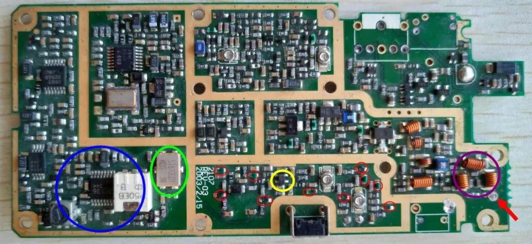 每個(gè)顏色的器件都能和前面的專業(yè)機(jī)型對(duì)應(yīng),其中電調(diào)部分采用空心線圈獲得更好的 Q 值,晶體濾波器與前款產(chǎn)品是同一品牌(KDS),淺藍(lán)色圈里的獨(dú)立本振是 TI 的 LMX2571,深藍(lán)色圈里是解調(diào)芯片AK2365A。這兩款芯片都是近年出現(xiàn)并被摩托和海能達(dá)專業(yè)機(jī)采用的型號(hào)。