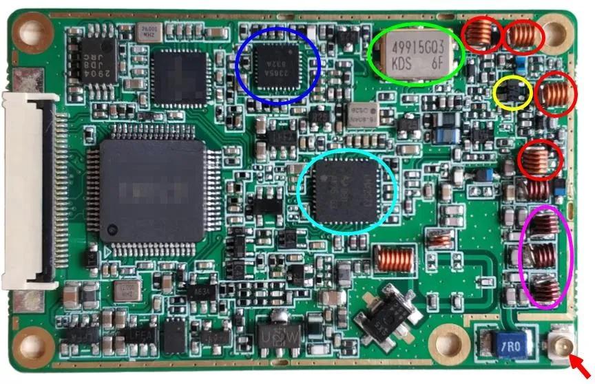這是日本的一款經(jīng)典產(chǎn)品。最右側(cè)紅色箭頭是天線輸入焊接口, 紫色圈里 3 個(gè)線圈是低通濾波器,黃色圈里是 LNA 放大管,若干紅色小圈內(nèi)是構(gòu)成電調(diào)濾波器的電感線圈和變?nèi)荻O管,綠色圈是晶體濾波器,晶體濾波器上方格子是獨(dú)立本振,藍(lán)色圈是解調(diào)芯片 TA31136 及配套器件。