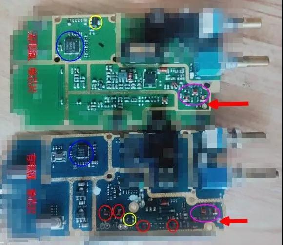 可以看到,兩款低端機(jī)器電路很簡(jiǎn)潔,藍(lán)色部分用國(guó)產(chǎn)接收芯片代替了專業(yè)機(jī)里面的一大片電路。上面那一款最低端的版本在 LNA 部分的電調(diào)濾波器(BPF)也省掉了,對(duì)抗干擾就只能看國(guó)產(chǎn)芯片自己了。
