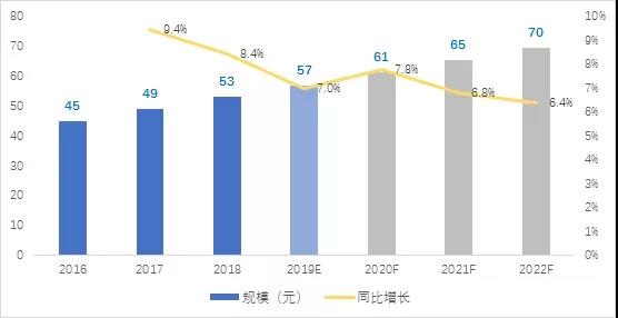 2018年汽車用柔性線路板(FPC)市場(chǎng)規(guī)模達(dá)53億元,同比增長(zhǎng)8.4%,市場(chǎng)的主要增長(zhǎng)動(dòng)力來源于汽車電子化程度的提升和新能源汽車滲透率的提升。預(yù)計(jì)2019年全球市場(chǎng)規(guī)模將達(dá)57億元,同比增長(zhǎng)7.0%。2016-2022年,汽車用FPC的年增長(zhǎng)速度長(zhǎng)期維持在6%-9%之間,至2022年汽車FPC市場(chǎng)規(guī)模將增長(zhǎng)至70億元。