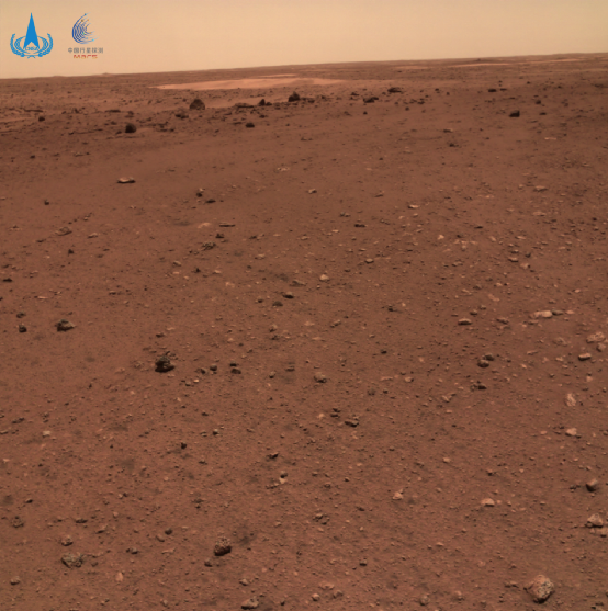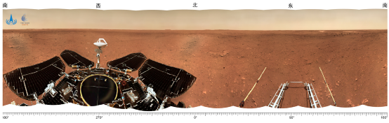 當(dāng)祝融號尚未駛離著陸平臺時,先由桅桿上的導(dǎo)航地形相機(jī)進(jìn)行360°環(huán)拍,經(jīng)過校正和鑲嵌拼接而成了這張全景圖。圖像顯示,著陸點(diǎn)附近地勢平坦,遠(yuǎn)處可見火星地平線,石塊豐度和尺寸與預(yù)期一致,表明著陸點(diǎn)自主選擇和懸停避障實(shí)施效果良好。