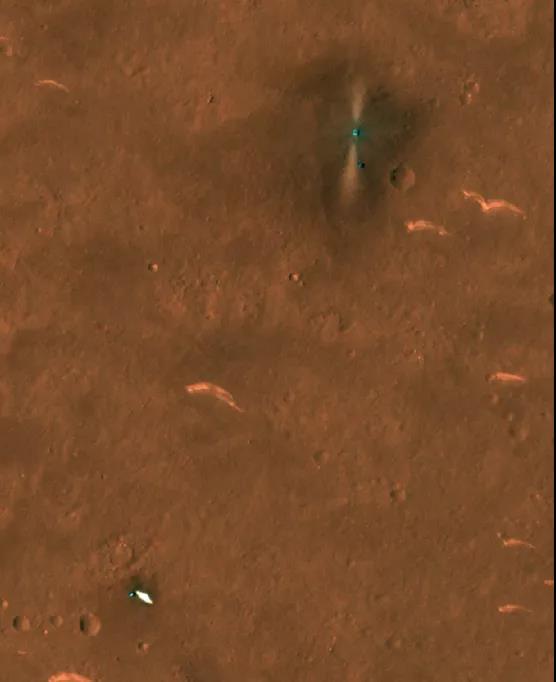除了祝融號自己拍攝的圖片外,近期美國的MRO火星軌道器搭載的HiRise相機(jī)也捕捉到了祝融及著陸平臺。