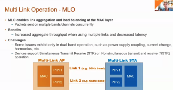 Wi-Fi 7引入的一個新特性就是上面提到的多鏈路操作(MLO),執(zhí)行MLO時,多個鏈路公用MAC網(wǎng)絡(luò)層,并采用單獨(dú)的物理層,這樣支持該特性的AP還是基站都能在多個頻段上同時執(zhí)行發(fā)射或接收操作,比如5GHz和6GHz。這樣極大地增加了吞吐量,同時降低了延遲。