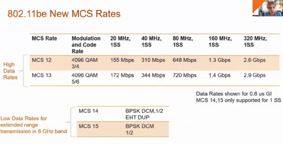 在802.11ax標(biāo)準(zhǔn)中,已經(jīng)為20MHz至160MHz的信道定義了12個MCS速率,而Wi-Fi 7在4096QAM調(diào)制方式的支持下,引入了速率更高的MCS 12和MCS 13。如果采用320MHz的信道,那么單條空間流上的速率最高可至2.9Gbps。
