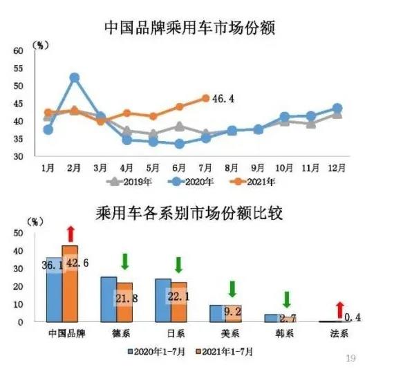 值得被關(guān)注的是,中國品牌乘用車市場份額繼續(xù)上升??梢钥吹?,7月中國品牌乘用車銷量為72萬輛,同比增長22.2% ,所占市場份額達 46.4%,上升11.1個百分點;1-7月累計銷量為492萬輛,同比增長42.8%,所占市場份額為 42.6%,同比上升6.5個百分點。