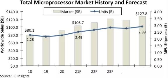 IC Insights在最近發(fā)布的《2021年麥克林報告》年中更新中表示,現(xiàn)在預(yù)計MPU銷售額將在2021年增長14%,這將使微處理器市場總額達(dá)到創(chuàng)紀(jì)錄的 1037億美元,而此前預(yù)計的增長為9%。