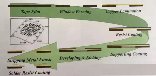 這種軟板結(jié)構(gòu)的制作方法,一般會采用基材涂附膠合樹脂,之后進(jìn)行沖壓去處空區(qū),接著再進(jìn)行銅皮壓合程序。這種做法由于需要組裝接合的區(qū)域,兩面都有銅皮暴露出來,因此組裝上不成問題。但是因為后續(xù)要進(jìn)行線路制作,這些無支撐區(qū)域失去了基材的支撐,無法進(jìn)行濕流程線路蝕刻,因此必須要增加一道保護(hù)膠涂裝程序,再進(jìn)行線路制作。在線路完成后,必須將保護(hù)膠去除才能進(jìn)行金屬表面處理,因此執(zhí)行程序就較為繁復(fù)。這類產(chǎn)品目前以TAB類產(chǎn)品為典型代表,如下圖。