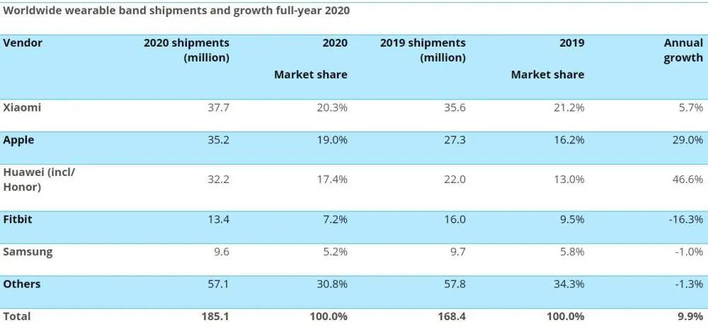 全球可穿戴設備市場在特殊的2020年經(jīng)受住了考驗,最終全年出貨量為1.85億件,同比2019年增長了9.9%,這算是一個還不錯的成績。