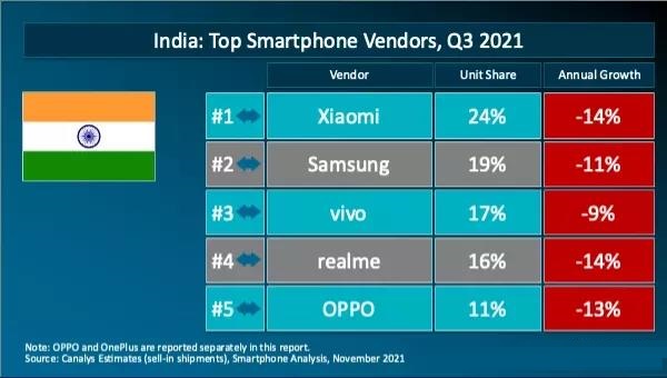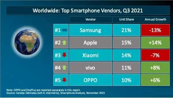 近日市場研究機構(gòu) Canalys 公布了 2021 年第三季度全球智能手機出貨的詳細數(shù)據(jù)。該季度全球共出貨 3.26 億部智能手機,較上一季增長 3%。其中三星以 6940 萬臺的出貨量領(lǐng)先,市場占比 21%;蘋果共出貨 4920 萬臺手機排名第二,而小米出貨 4400 萬臺排名第三,市場占比 14%。在全球范圍,vivo、OPPO 分別位列第四、第五名。