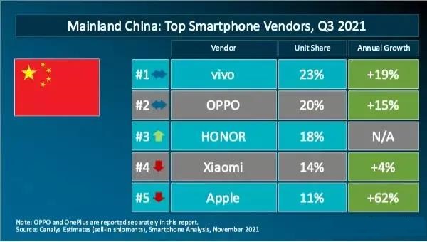 據(jù)指紋模塊軟板廠了解,2021 第三季度,中國大陸出貨最多的智能手機廠商是 vivo,市場占比 23%,出貨同比增長 19%。排名第二的是 OPPO,占比 20%,同比增長 15%。榮耀該季度出貨量增長迅速,占比 18% 排名第三,超越了小米和蘋果。此外,小米、蘋果分別以 14%、11% 的占比位列第四、第五。