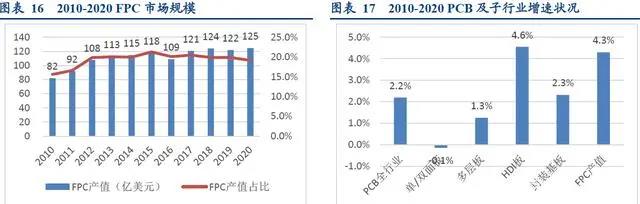 柔性電路板 也是PCB行業(yè)過(guò)去十年中增速較快的細(xì)分品種之一,其2010-2020年的復(fù)合增速為4.3%,僅次于HDI板的4.6%,遠(yuǎn) 高于PCB行業(yè)2.2%的整體增速。柔性電路板 板塊占PCB整體的比重也從15.6%提升至19.1%。