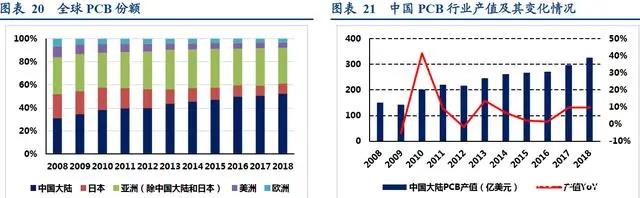 據(jù)Prismark統(tǒng)計(jì),中國(guó)大陸是全球最主要的PCB產(chǎn)能區(qū),相關(guān)產(chǎn)值在2018年超過(guò)300億美元,占全球份額比重也達(dá)到了52.4%。