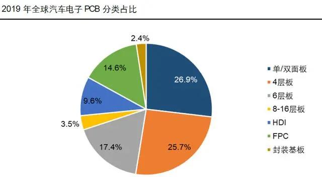 從汽車PCB分類來(lái)看,單層到多層板依然占據(jù)主流,合計(jì)占比73.5%;HDI占比9.6%;柔性電路板占比14.6%;封裝基板占比2.4%。