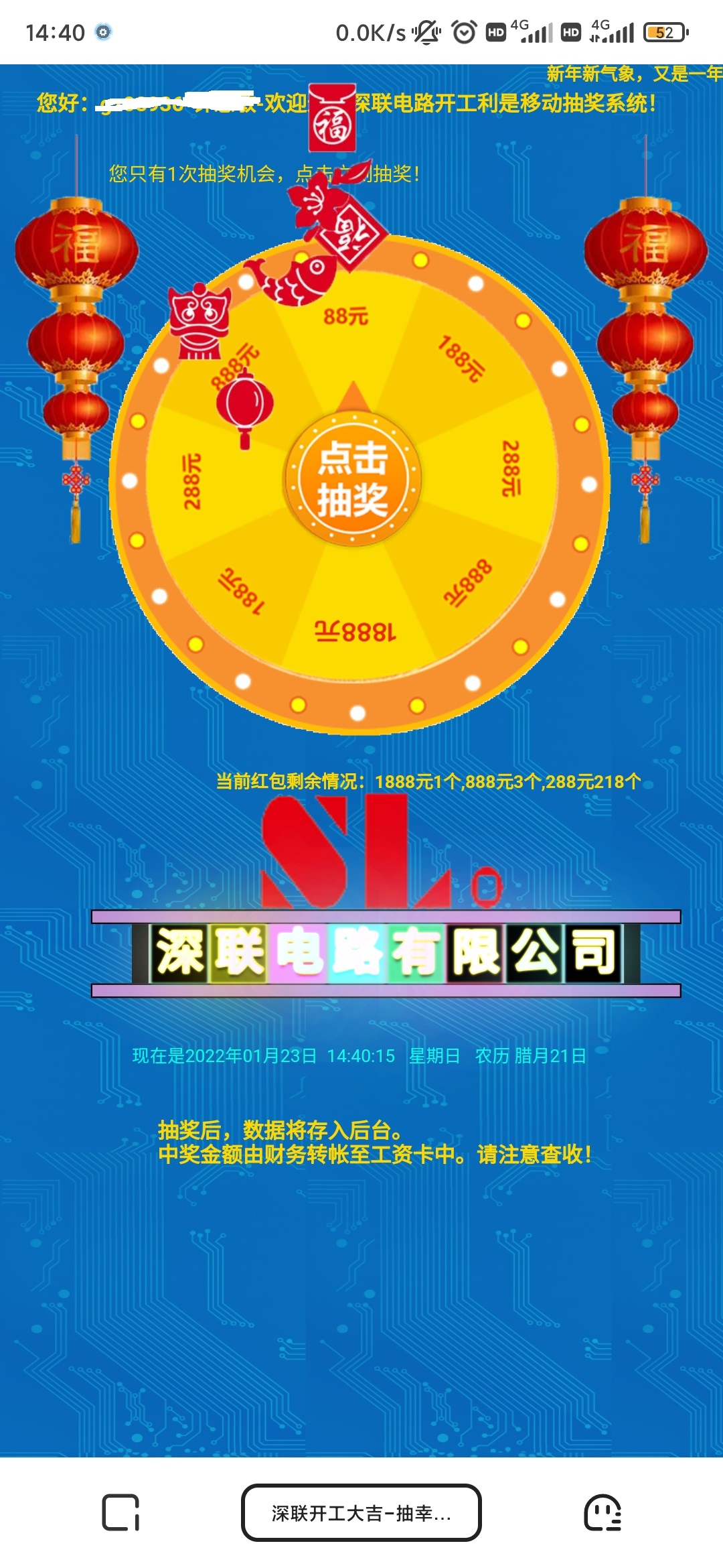 ●中獎(jiǎng)名單公示于開工大吉看板中,獎(jiǎng)金由財(cái)務(wù)部工作人員轉(zhuǎn)帳至工資卡中(188元含以上的人員開獎(jiǎng)后到一樓大廳頒獎(jiǎng)拍照留念哦~)。1888花落誰家?現(xiàn)在轉(zhuǎn)發(fā)錦鯉還來得及~
