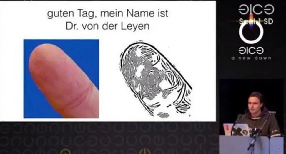在 2014 年的活動演示中,他所使用的圖片,是馮德萊恩出席新聞發(fā)布會的現(xiàn)場圖片,照片中的她豎起了右手大拇指,Jan Krissler 借此照片,配合一臺 Verifinger 掃描設(shè)備復(fù)制出部長的完整指紋。Jan Krissler 并不想利用這種技術(shù)作惡,反而希望以此喚醒大眾對指紋安全的警惕無獨(dú)有偶,日本國立情報(bào)學(xué)研究所 (NII) 的科學(xué)家在 2017 年成功從一張三米開外拍攝的照片中,提取出可用的指紋,如今的手機(jī)攝像頭動輒幾千萬像素,所拍相片的清晰程度遠(yuǎn)比當(dāng)年要高,顯然要從相片中收集到清晰的指紋并非難事。