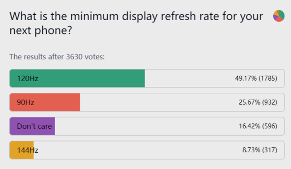 數(shù)據(jù)顯示,僅有16.42%的網(wǎng)友認為手機屏幕是否支持高刷新率并不重要;支持120Hz刷新率的手機屏幕受到了超49%的網(wǎng)友認可,這或許與各大手機廠商著重宣傳120Hz高刷新率屏幕有關(guān);25.39%的網(wǎng)友認為,自己更加傾向支持90Hz刷新率的屏幕,僅有8.62%的網(wǎng)友更加支持144Hz高刷新率的屏幕。
