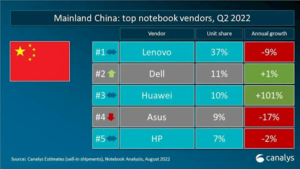 在中國大陸市場,前五位分別為聯(lián)想(37%)、戴爾(11%)、華為(10%)、華碩(9%)、惠普(7%)。