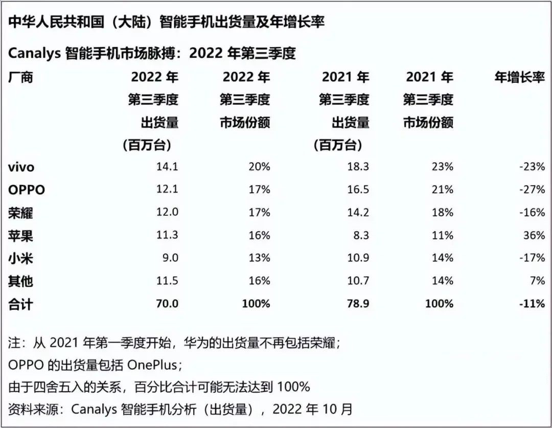 OPPO 2022年第三季度在中國智能手機(jī)市場出貨量1080萬臺,同比下降27.9%,市場份額16.3%排名第三。