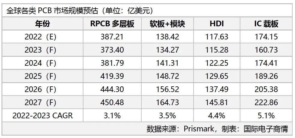 作為電子產(chǎn)品之母,PCB產(chǎn)業(yè)同樣因終端市況不佳而出現(xiàn)市場(chǎng)規(guī)模的小幅度衰退。所幸的是,2024年起PCB市場(chǎng)規(guī)模將恢復(fù)逐年成長(zhǎng),其中IC載板作為集成電路先進(jìn)封裝的關(guān)鍵基材,今后五年的成長(zhǎng)率將領(lǐng)銜上升。