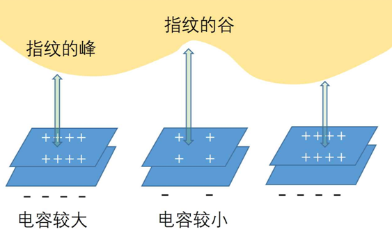 我們的手機(jī)放在指紋識(shí)別器上時(shí),我們手指指紋的凸面會(huì)離一些電容更近,由于我們的皮膚是導(dǎo)電的,因此會(huì)影響下面電容的容量,離得近的凸紋會(huì)增大下面電容器的電荷容量,而離得遠(yuǎn)的也會(huì)增加電容的容量,但是增加的沒(méi)有指紋峰處那么多,因此,指紋的凹凸距離就可以被下面非常多的微笑電容所檢測(cè)到。