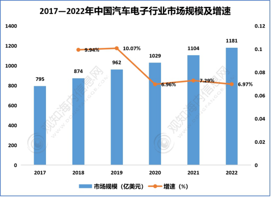 2017—2022年中國汽車電子行業(yè)市場規(guī)模及增速