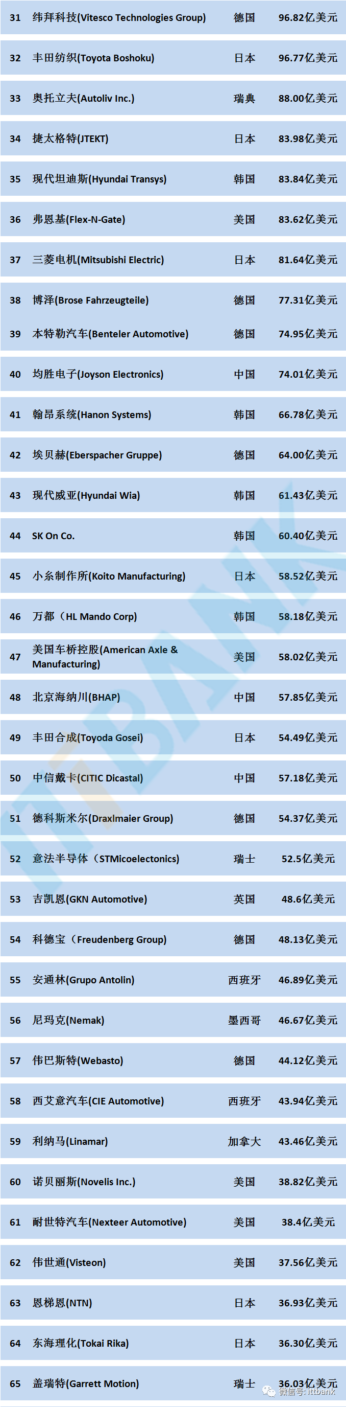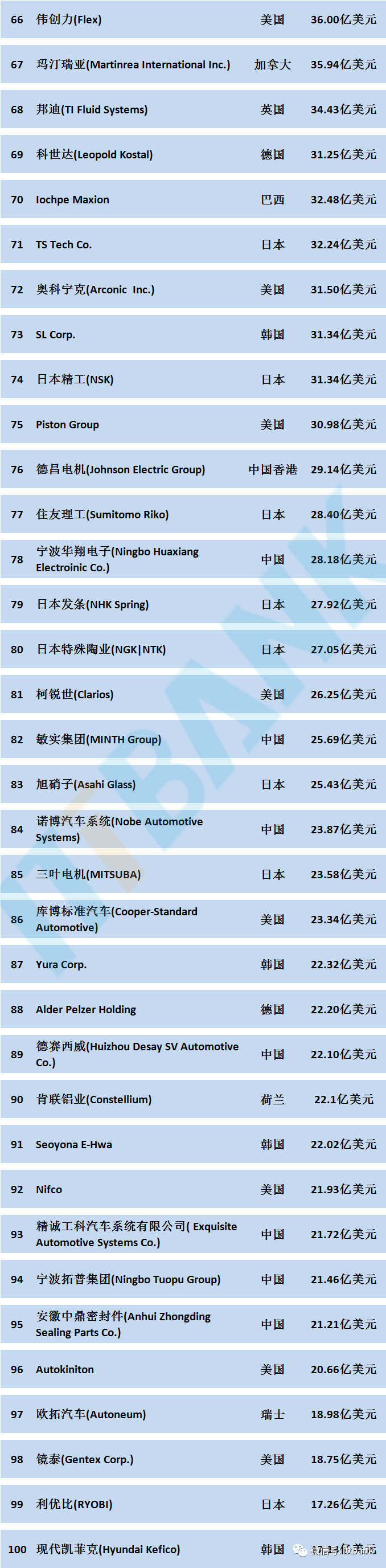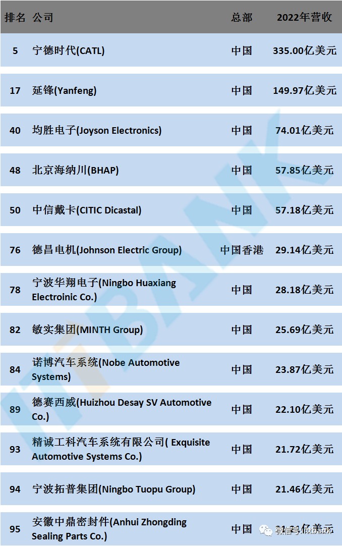 電池FPC廠了解到,2023年全球汽車零部件供應(yīng)商百強(qiáng)中國上榜企業(yè)排名如下:
